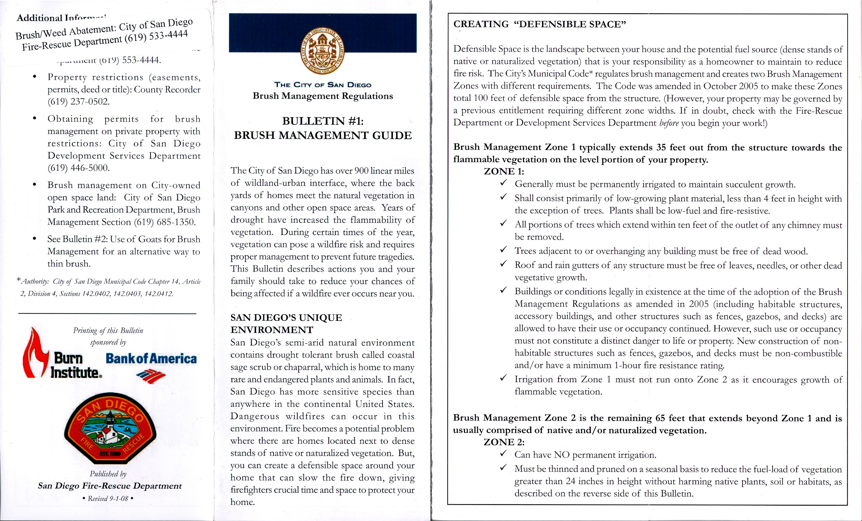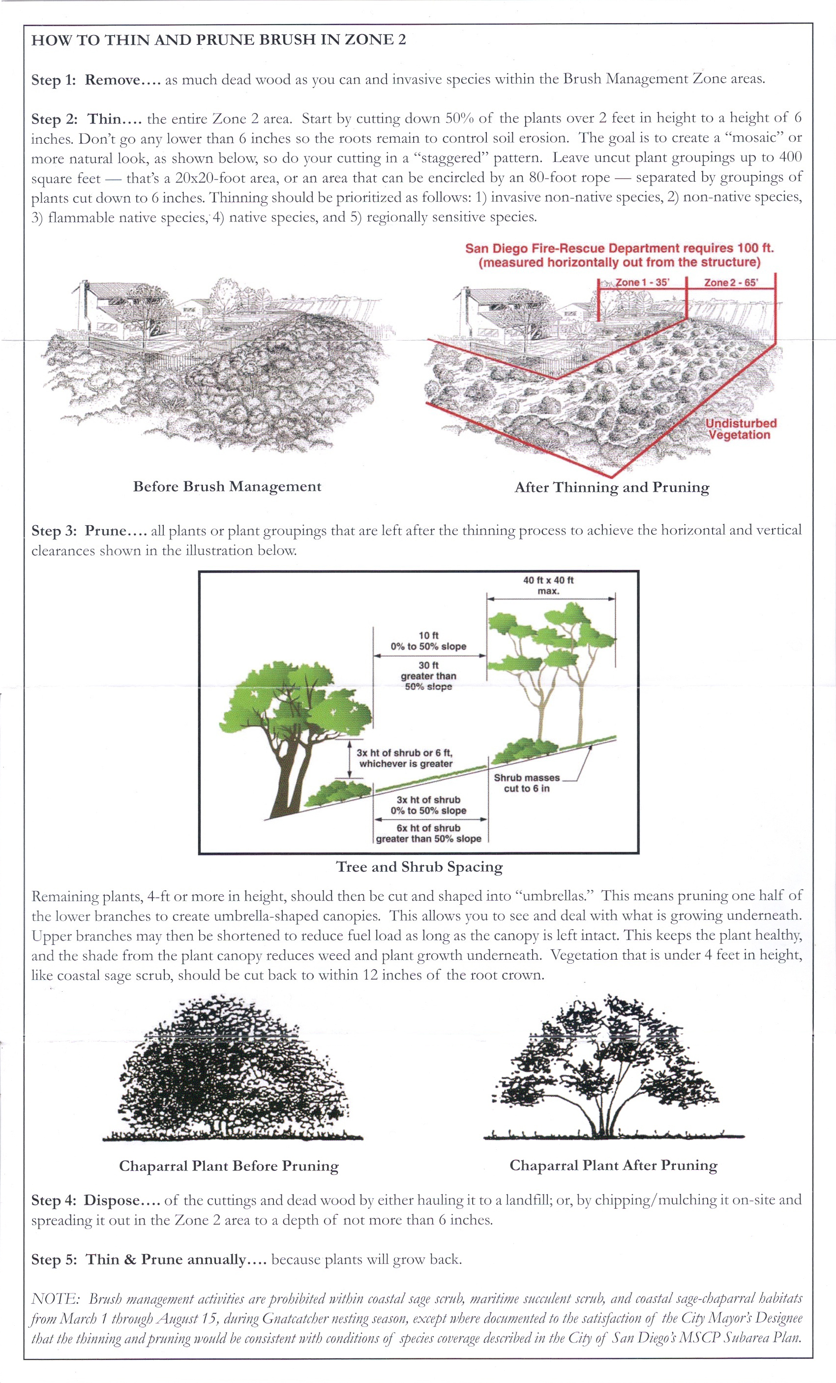 Residential brush removal and fire abatement rules, regulations and suggestions. CONTACT MEProtect your home now from catastrophic damage during a brushfire. Contact me for a consultation to create a "defensible space" around your property. It's an improvement that will add peace of mind! Click the images below for larger pictures of some local Brush Management Regulations pamphlet, or click HERE and HERE for the front and back as a downloadable PDF document. PDF front |